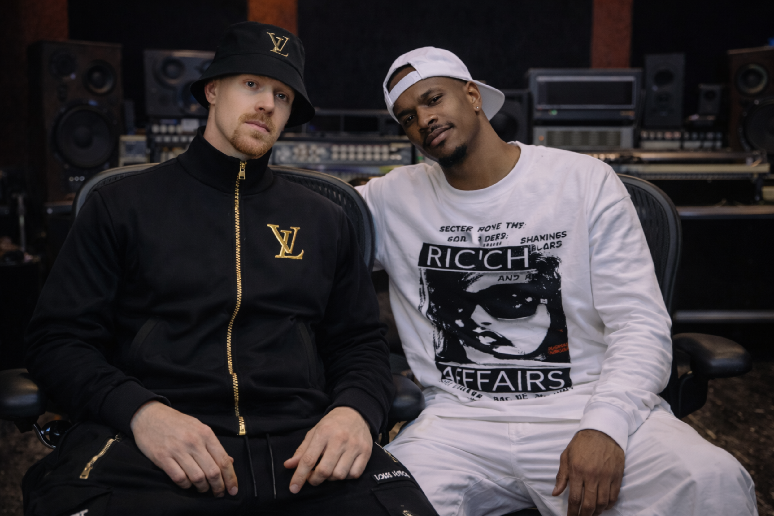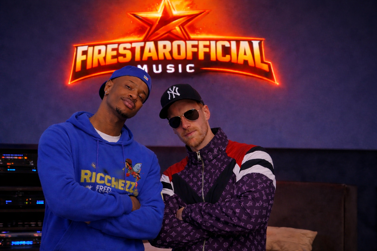 FirestarOfficial and RaxOfficial producing music together in FL Studio, collaborating on a beat in a modern recording studio.